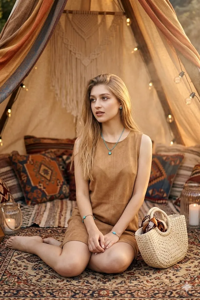 Edit my photo and change my outfit into a tan suede dress with simple turquoise jewelry. Change the background into a cozy boho tent setup with pillows and rugs. Keep my face same as original photo. Change my pose into sitting cross leg on a rug and looking slightly away from camera. Use warm soft lighting with glowing effect to match festival mood and keep full image very realistic and natural.