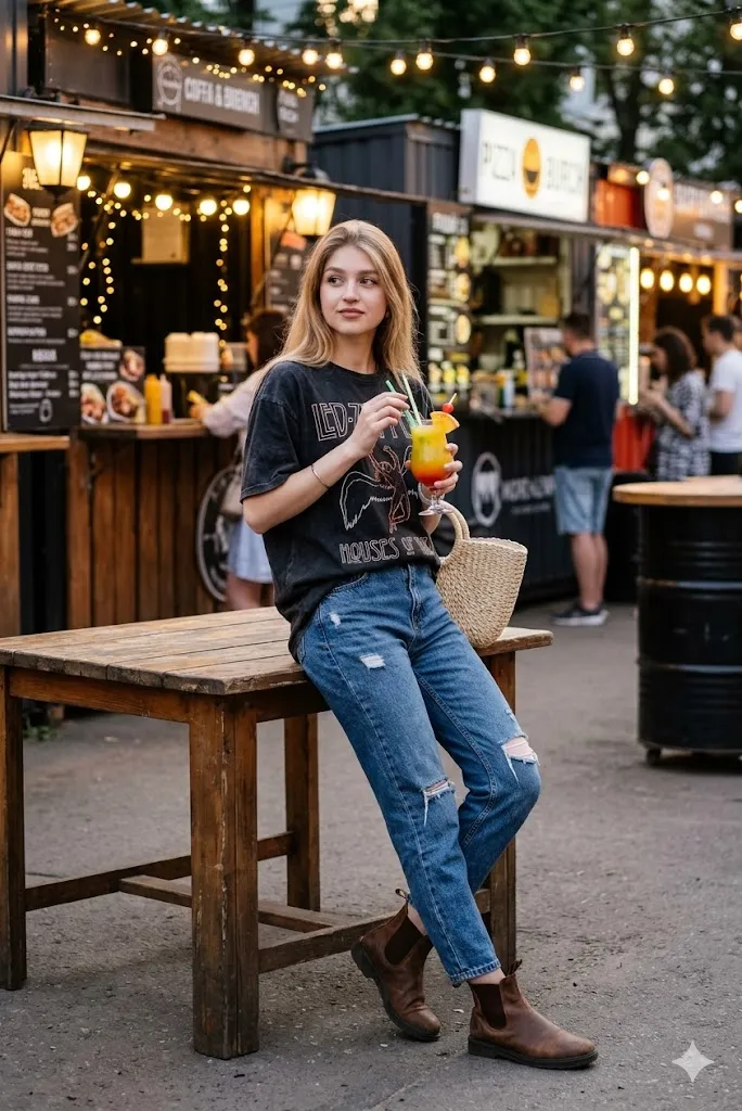 Edit my photo and change my outfit into an oversized vintage band t shirt with boots. Change the background into a food stall area with lights above. Keep my face same and natural. Change my pose into leaning on a table while holding a colorful drink. Make it look like a natural street style photo with soft shadows and real lighting.