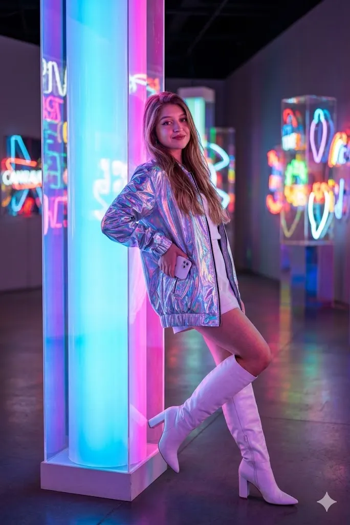 Edit my photo and place me near a neon light art setup. Change my outfit into a holographic jacket with white boots. Keep my face same without change. Change my pose into leaning back on a glowing pillar with confident look. Add neon light reflection on skin and clothes with high contrast lighting and keep image very sharp and realistic.