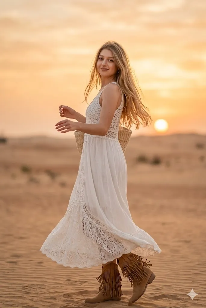 Edit my photo and change my outfit into a white lace crochet maxi dress with soft fabric texture and add tan suede fringe boots. Change the background into a wide desert area during sunset with warm orange light and soft sky tones. Keep my face exactly same as original photo and do not change facial features. Change my pose into a natural twirl from side angle while looking back with a soft smile. Add shallow depth blur in background using 85mm lens style and keep skin texture very realistic in high quality.