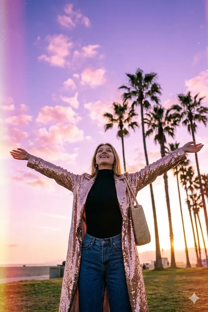 Edit my photo into a wide angle evening shot. Change my outfit into a long shining coat over a bodysuit. Change the background into tall palm trees with purple and pink sky during sunset time. Keep my face same and natural. Change my pose into standing with open arms showing freedom feeling. Add light grain effect for film style look but keep image very realistic and clear with cinematic lighting.