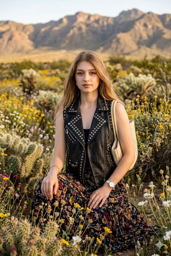 Edit my photo and change my outfit into a long floral skirt with soft flow and a black leather vest with silver studs. Change the background into a desert flower field with mountains far in distance. Keep my original face same without any change. Change my pose into sitting on knees among flowers while looking straight at camera with calm expression. Add strong detail in fabric and skin with high quality texture so image looks like real photoshoot.