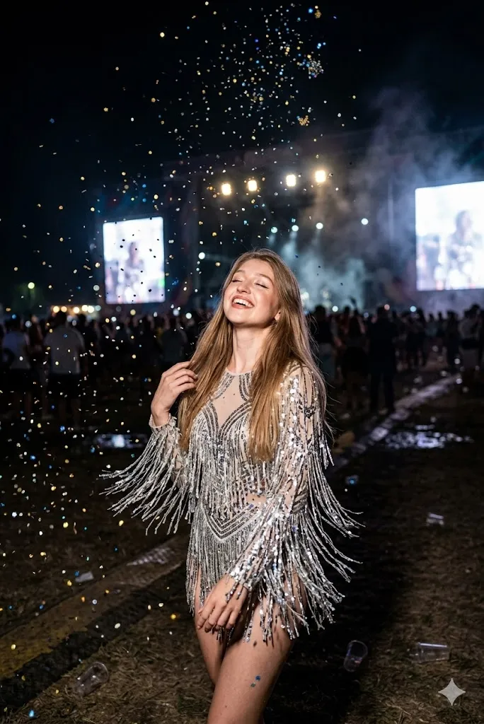 Edit my photo and change my outfit into a shiny fringe bodysuit. Change the background into a dark open festival ground with glitter falling in air. Keep my face same as original. Change my pose into looking up with closed eyes and big smile. Add fast capture effect to freeze glitter in air and keep image very detailed and realistic.