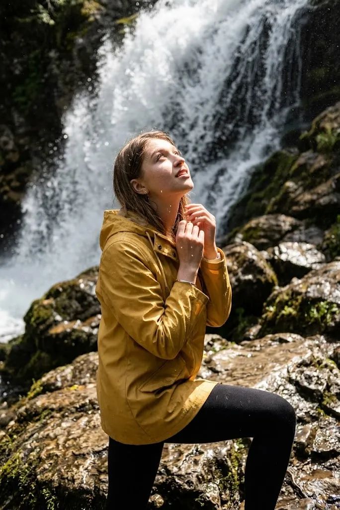 Edit my photo and place me near rocks close to the waterfall. Change my outfit into a yellow raincoat with simple leggings. Set my pose as looking up towards falling water. Add water drops on face and clothes. Keep my face same and clear. Use strong detail and action style lighting for a realistic outdoor feel.