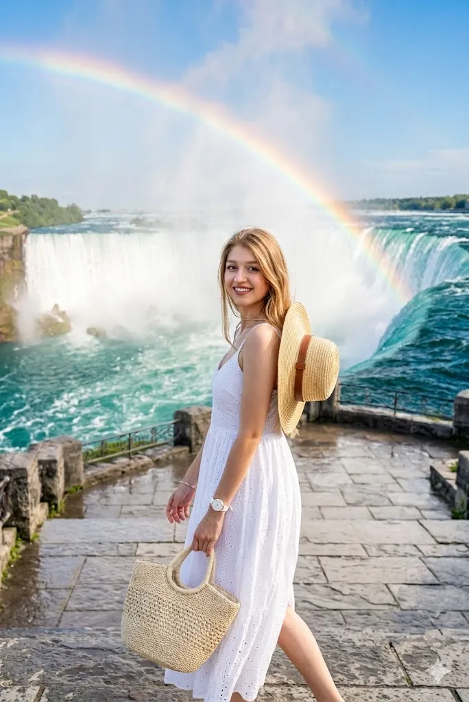 Edit my photo and place me in front of Niagara Falls with a clear rainbow in background. Change my outfit into a white dress with a hat on back. Set my pose as walking towards camera with a natural smile. Add soft water spray in air. Keep my face same with smooth skin tone. Use bright light and vibrant colors to create a fresh and real travel feel.