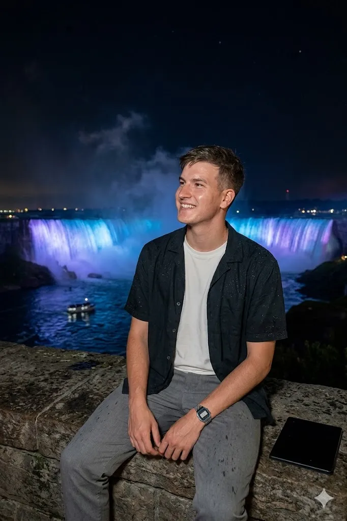 Edit my photo and place me at Niagara Falls during night time. Change my outfit into a dark shirt over a light inner tee. Set my pose as sitting on a stone edge and looking towards the falls. Add blue and purple lights on the waterfall in background. Show small water drops on clothes for realism. Keep my face same and match lighting with night scene. Use high contrast and sharp detail for a realistic night photo look.
