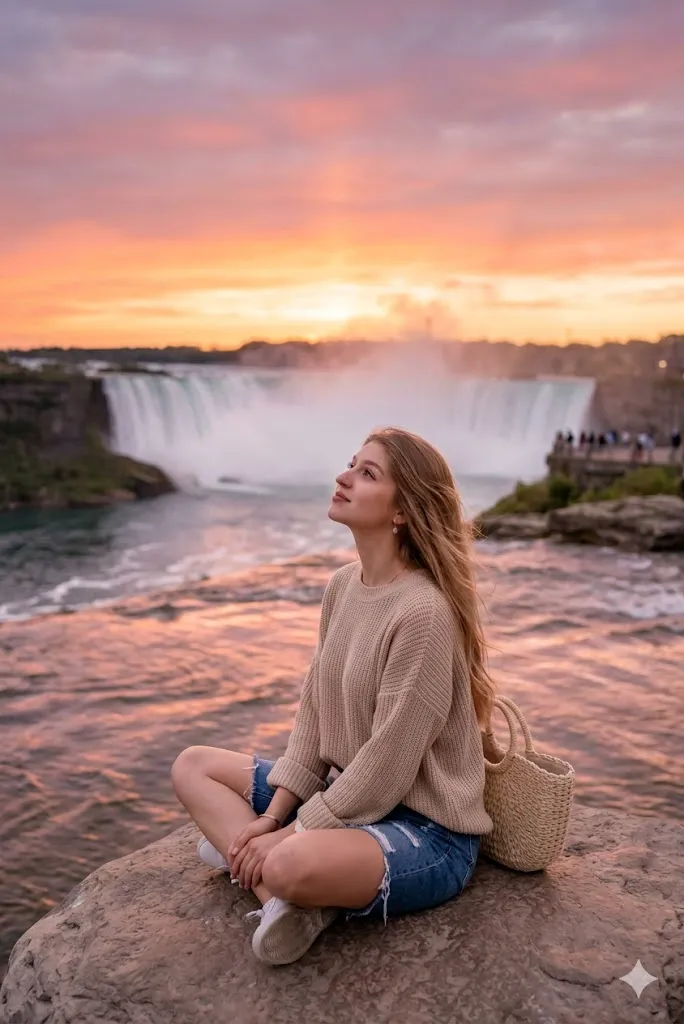 Edit my photo and place me at Niagara Falls during sunset time. Change my outfit into a loose sweater with denim shorts. Set my pose as sitting calmly and looking towards sky. Add orange and pink sky reflection in background water. Keep my face same and match light with sunset glow. Make it look soft and peaceful.