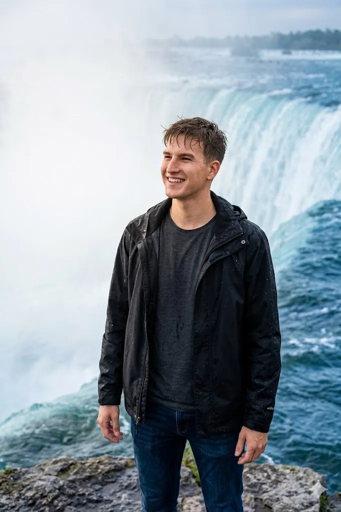 Edit my photo and place me at the edge of Niagara Falls with a strong mist view. Change my outfit into a black waterproof jacket with dark jeans. Set my pose as standing with confidence and looking slightly away towards the waterfall. Add natural wet hair effect and soft water drops on clothes. Keep my face exactly same as original with natural skin tone. Background should show heavy white mist and fast flowing blue water. Use cinematic lighting and sharp focus with ultra realistic details.