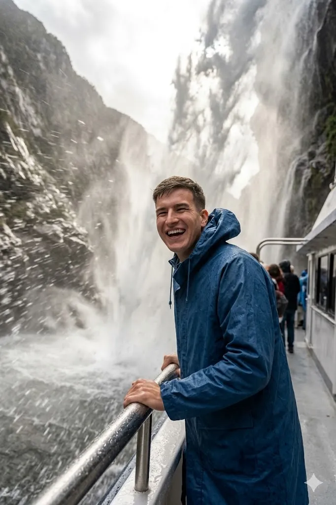 Edit my photo and place me on a boat near the waterfall. Change my outfit into a blue raincoat with open hood. Set my pose as holding the railing while water splashes around. Add motion effect in water but keep my face clear and sharp. Background should show huge falling water close to me. Keep my facial features same. Make it look like a real action travel photo with strong depth and natural water effect.