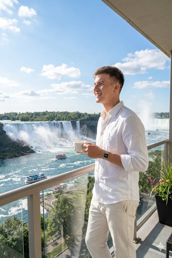 Edit my photo and place me on a hotel balcony facing Niagara Falls. Change my outfit into a white shirt with simple pants. Set my pose as relaxed and holding a coffee cup while looking outside. Background should show wide waterfall under blue sky. Keep my face same with natural light on it. Add clean travel photography style with high detail and soft sunlight.