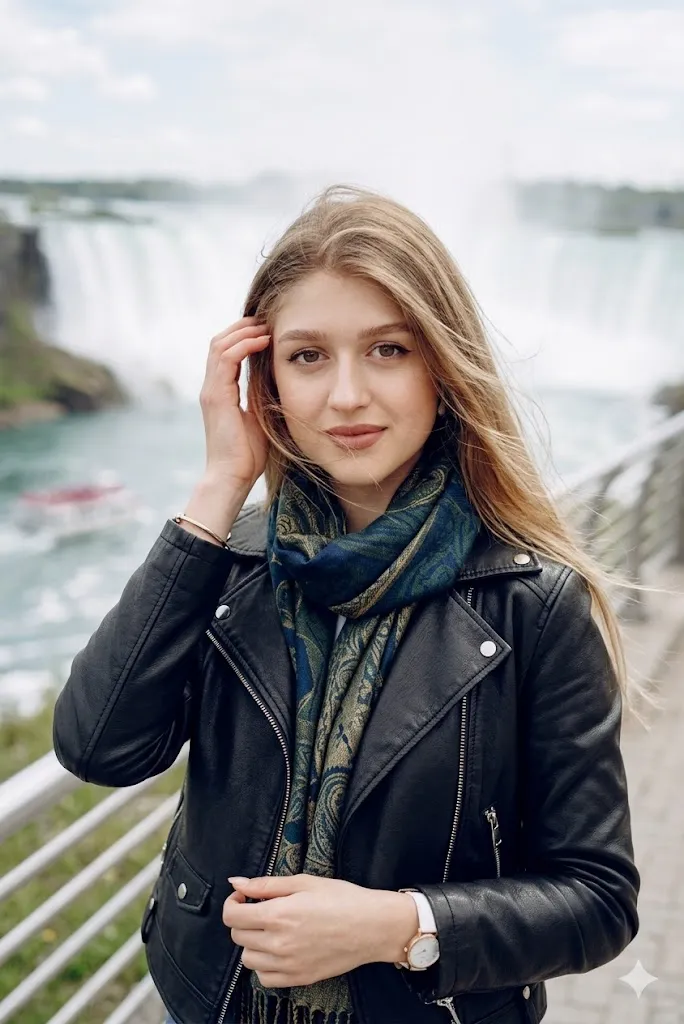 Edit my photo and create a close shot at Niagara Falls walkway. Change my outfit into a leather jacket with a stylish scarf. Set my pose as fixing hair and looking into camera. Blur the background slightly but keep waterfall visible. Keep my face same and natural. Add soft light and wind effect in hair for a professional look.