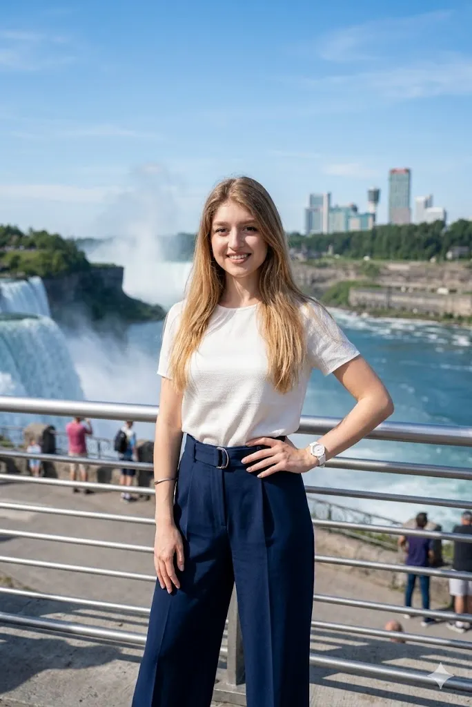 Edit my photo and place me on the Canada side with city and waterfall both visible. Change my outfit into a modern top with wide pants. Set my pose as standing with one hand on waist. Keep my face same with natural smile. Add clear background with blue water and clean skyline. Use high fashion style with realistic lighting.