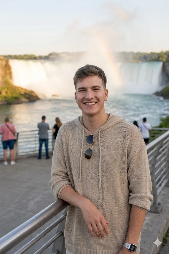 Edit my photo and place me on a Niagara Falls viewing deck during evening time. Change my outfit into a loose beige hoodie with sunglasses hanging on the neck. Set my pose as leaning on the railing with one hand and smiling at camera. Keep my face same without changes. Add soft warm light and a natural rainbow effect in the mist behind. Make the scene look like a real travel photo with clean background and natural light balance.