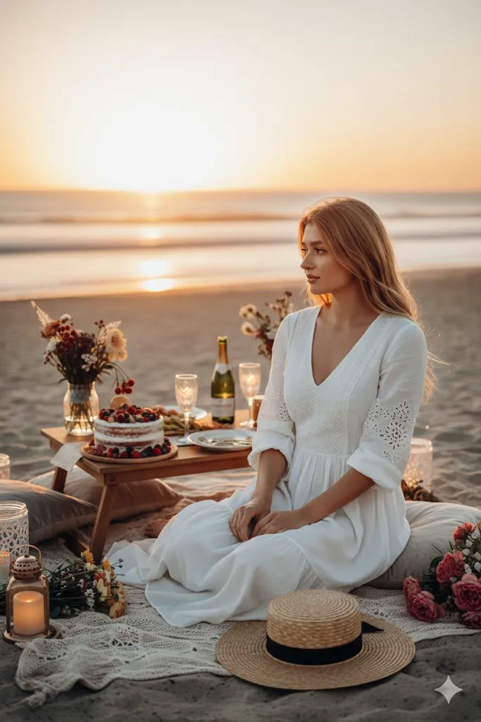 Use the girl face from the uploaded photo and place her in a luxury beach picnic setup in Malibu. She is wearing a trendy white boho linen dress. A wide straw hat is kept beside her. In the background there is ocean sunset, picnic blanket, flowers, and a vintage style cake. Do not change her facial identity. Lighting should be soft and warm with natural human skin texture. No smooth plastic skin effect. Pose should look relaxed and natural, looking slightly away from camera. Final image should be ultra high definition 8K quality.