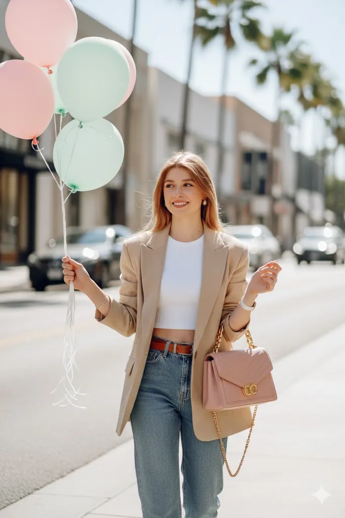 Edit the uploaded image and show the girl walking on a sunny street in Beverly Hills. Change her clothes into an oversized blazer, crop top, and high waist denim jeans. She is holding pastel color balloons in one hand and a designer handbag in the other hand. Keep her original face, hair texture, and body shape exactly same. Add slight motion blur in background to focus on her. Photo should look like real social media street photography with natural sunlight, real shadows, and 4K resolution.