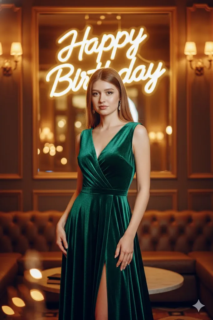 Transform the uploaded photo into a VIP lounge birthday scene. Change her outfit into a rich velvet emerald green gown. Background should be a premium lounge with golden tones and soft light blur effect. Behind her there is a glowing Happy Birthday sign. Keep her facial structure and expression fully original. Skin must show natural micro texture without blur effect. Render in 8K with studio level lighting. The final result should look like a fashion magazine cover photo.