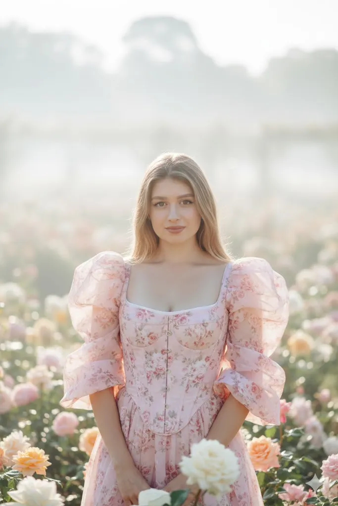 Edit the uploaded image and place her inside a beautiful English rose garden full of blooming roses. She is wearing a soft pink floral corset dress with puff sleeves. There is light morning mist in the air. Her face and body shape must stay fully same as original photo. Lighting should be bright and dreamy. Highlight natural skin texture and soft fabric detail. Final output should be ultra realistic 4K image that feels like a romantic movie scene.