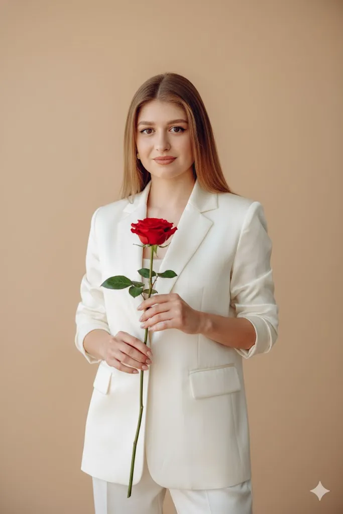 Change the background into a clean studio setup with soft beige backdrop. The girl is wearing an off white silk power suit. She is holding a single long rose in her hand. Keep her full facial identity original including eyes, nose, lips, and skin tone. Use professional three point lighting effect to create depth and natural skin tone. Final output should be high resolution 8K image like real studio photography.