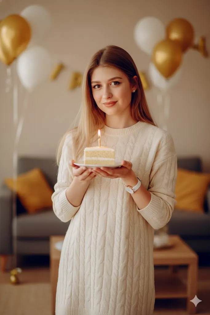 Edit the uploaded photo and show her inside a cozy living room decorated with white and gold balloons. She is wearing a soft knitted sweater dress and holding a cake slice with a lit candle. Lighting should feel warm and natural like premium phone camera photo. Keep her face and body structure fully same as original. Focus must be sharp on her face with visible skin pores and natural eye reflection. Final result must look ultra realistic in 4K quality.