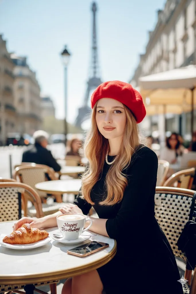 Use the girl face from the original photo and place her at a stylish Paris street cafe. She is wearing a classic black dress with pearl necklace and a chic beret. On the table there is a croissant and a latte with Happy Birthday chocolate message. In background a blurred Eiffel Tower is visible. Keep her face and smile exactly same. The image should look clean and bright like travel influencer photo. Skin texture must look real with natural shadows and 8K clarity.