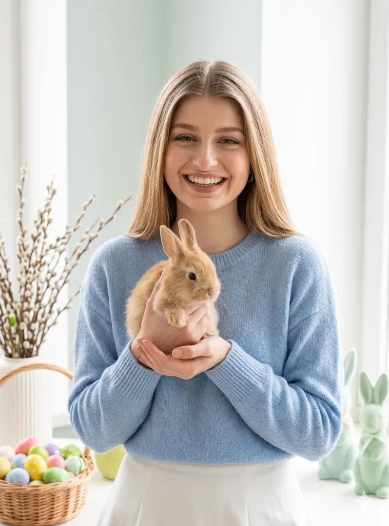 Edit my photo into a happy Easter moment. Keep my face same. Add a soft blue sweater and a simple skirt. Show me holding a small real bunny and smiling with joy. Add a simple Easter setup in background with light colors and soft decoration. Keep lighting natural and bright. Focus on my face and bunny. Make fur texture and skin look real. Give a natural camera feel.
