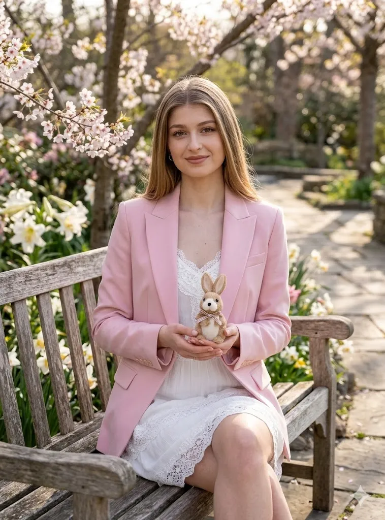 Edit my photo into a calm garden setup. Keep my face same and clear. Add a light pink blazer with a white dress. Make me sit in a small garden area with flowers like cherry blossom and white lilies. Add a small Easter bunny decor in my hand. Keep my pose relaxed and smiling softly. Use morning light and smooth shadows. Make the whole image look clean, soft, and realistic with natural colors.