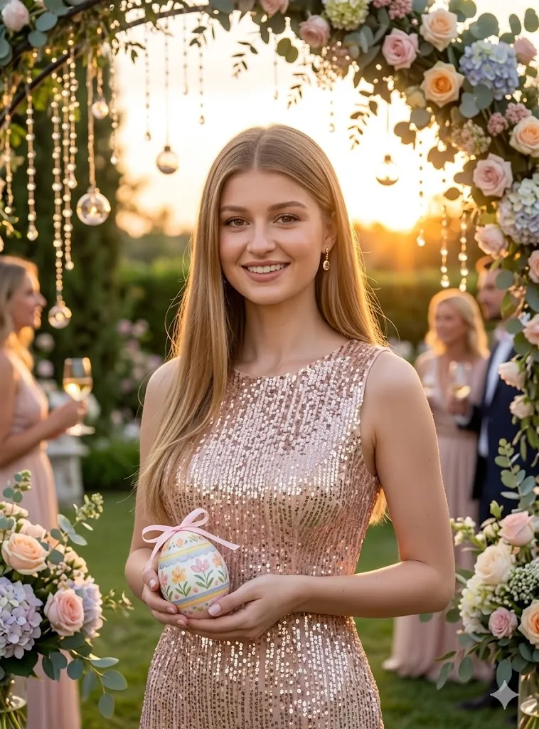 Edit my photo into an evening party look. Keep my face same. Add a soft shiny dress. Place me in an outdoor setup with lights and flowers. Show sunset light in background. Add a small decorative Easter prop in my hand. Keep lighting warm and smooth. Focus on my face and dress details. Make image look like a real evening shoot.
