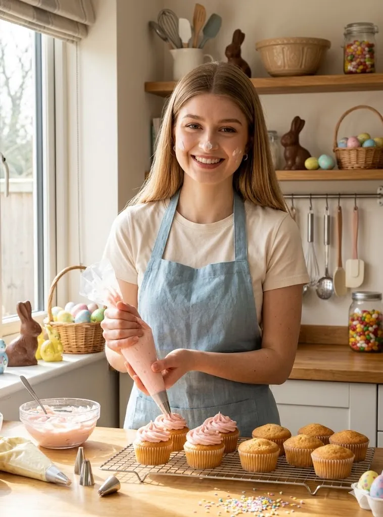 Edit my photo into a kitchen scene. Keep my face same. Add a simple outfit with apron. Show me making cupcakes or decorating food. Add small flour mark on face for fun look. Keep background with kitchen tools and Easter sweets. Use natural window light. Focus on my face and hands. Make everything look real and detailed.