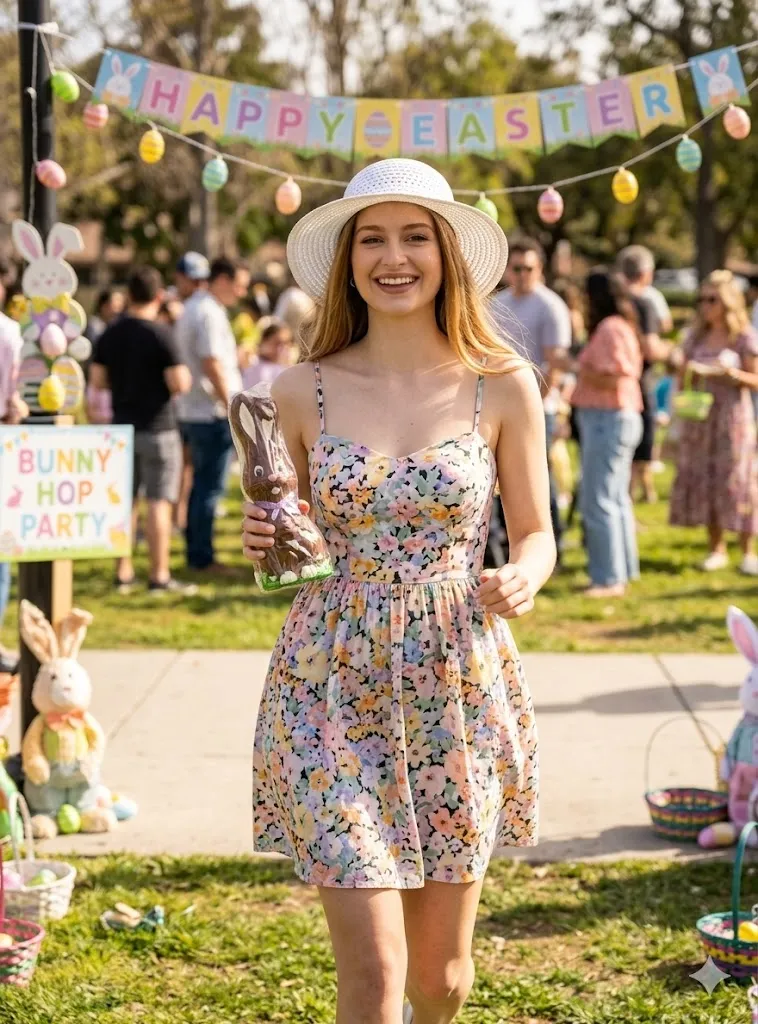 Edit my photo into a fun outdoor party scene. Keep my face same. Add a stylish floral outfit and a white sun hat. Show me running or walking with a smile. Add Easter banner and decorations in background. Put a chocolate bunny in my hand. Use bright sunlight and natural shadows. Keep background slightly busy but blur. Focus on my expression and make image look real and lively.