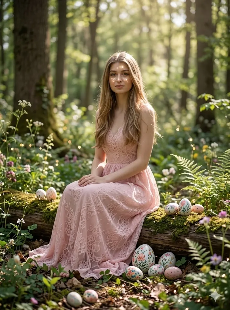 Edit my photo into a forest scene. Keep my face same. Add a soft pastel dress. Place me sitting on a wooden log with Easter eggs around. Add soft light coming through trees. Keep mood calm and dreamy but still real. Add natural plants and soft glow lights. Keep image realistic with good depth and detail.