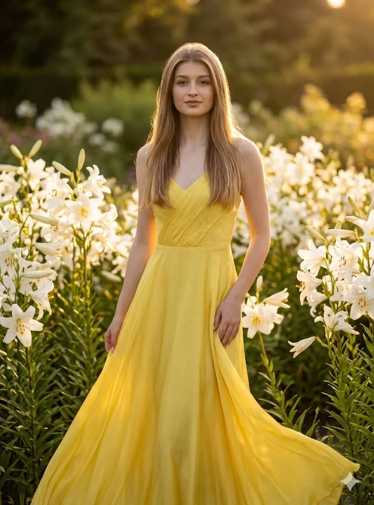 Edit my photo into a stylish garden look. Keep my face same. Add a long yellow dress with soft flow. Place me in a garden full of white lilies. Make my pose simple and confident. Add warm evening light for a golden glow. Keep background soft blur and highlight my face and dress. Make image very clean and sharp with real texture and soft light.