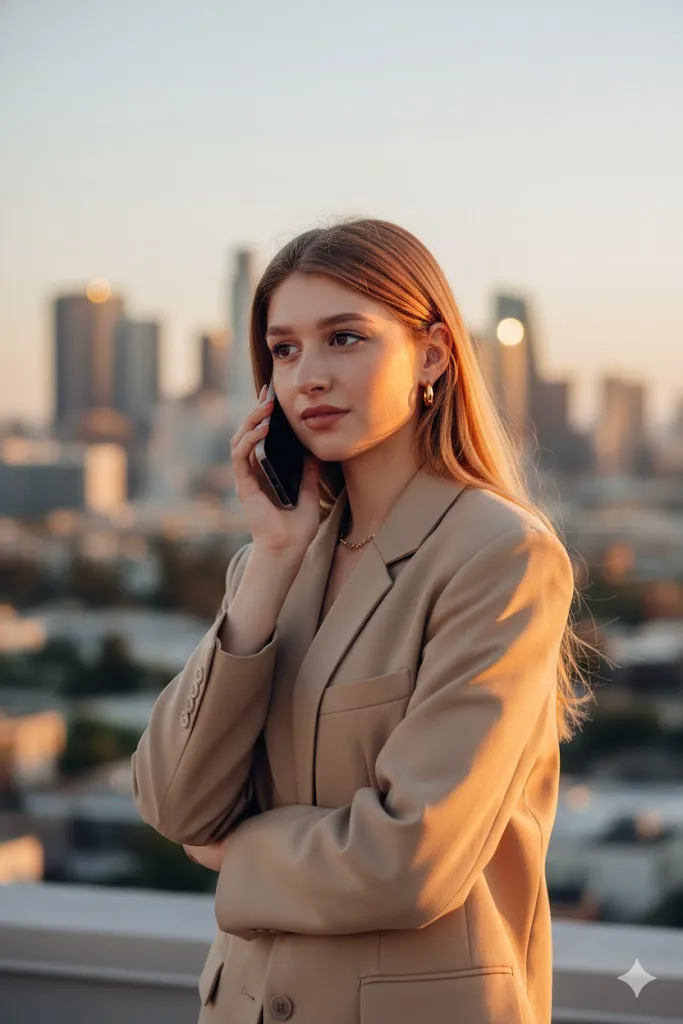 Edit this photo and place the subject on a luxury skyscraper rooftop during golden hour. Change clothing to a stylish beige oversized blazer with gold accessories. Use warm orange sunlight hitting one side of the face with professional rim light. Keep the original face and expression exactly same. Show a blurred Los Angeles city view at sunset in the background. Use DSLR camera look with wide angle effect. The final image must look like a real photo with natural skin detail, soft shadows, and ultra clear 4K quality.