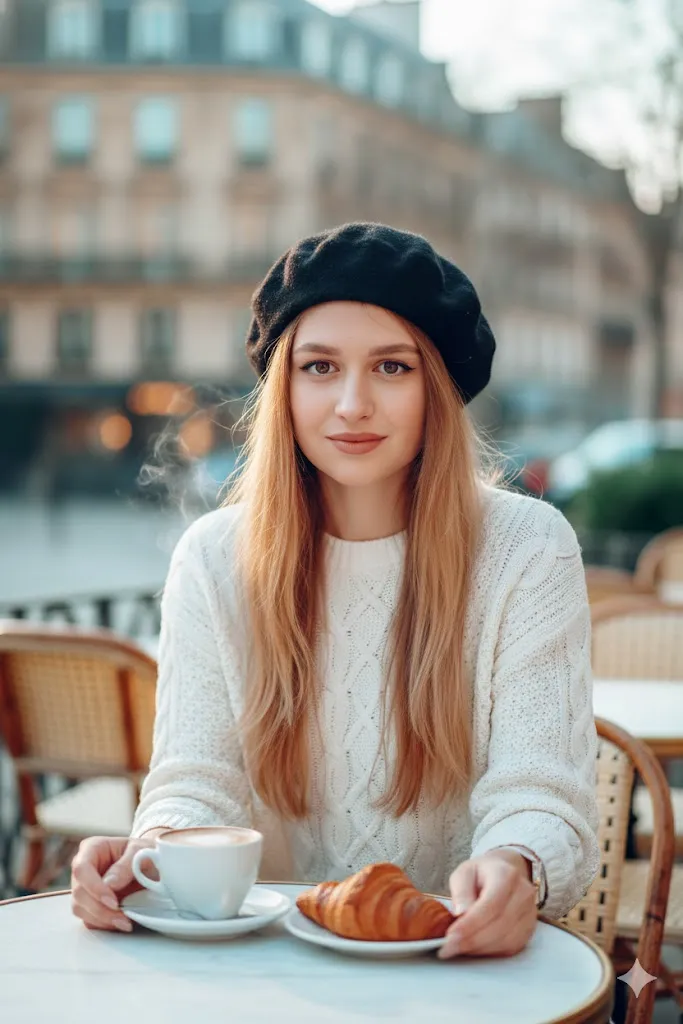 Recreate the uploaded photo in a cozy high end Paris street cafe. Change the outfit to a chic white knit sweater with a stylish beret. The person should sit at a marble table with latte and croissant visible in frame. Maintain original facial features and eyes. Show soft morning light with blurred Paris buildings in background. Focus on real fabric texture and natural steam from coffee. Skin must look natural in daylight without artificial smoothness. Use soft teal and orange color tone.