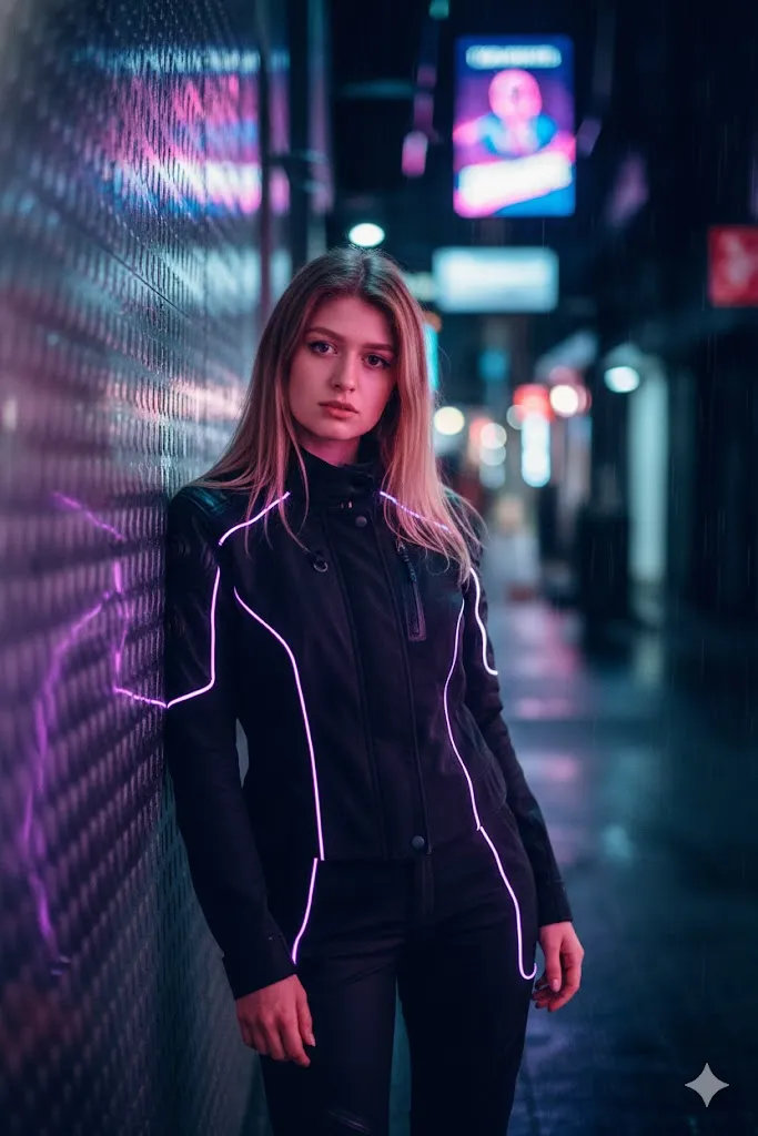 Place the person in a futuristic urban alley at night. Change outfit to a tech wear tactical jacket with glowing purple light accents. Use dramatic blue and pink neon lights reflecting on skin. Keep the original face shape and features fully accurate. Add depth in background with holographic signs and soft light circles. Use 35mm film style look with realistic skin grain and sharp eye detail. Pose should feel confident against a metal wall like a movie poster scene.