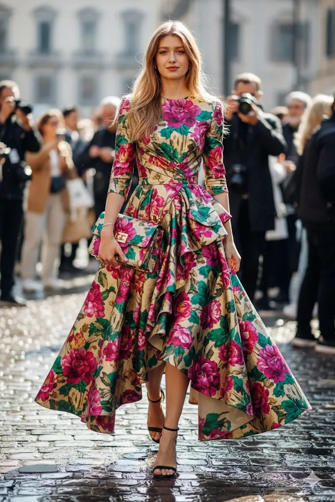 Edit the image like a paparazzi shot from Milan Fashion Week. Change outfit to a luxury floral designer dress with matching handbag. Capture the person walking on cobblestone street with blurred fashion crowd in background. Keep the face exactly same as original photo. Use bright natural midday sunlight with soft shadows. Image quality should look like a magazine cover in 8K detail. Focus on fabric texture and natural hair shine.