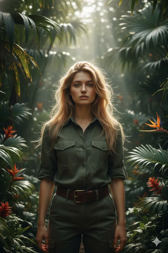 Transform the uploaded photo into a cinematic jungle adventure scene. Change clothing to olive green safari outfit with leather belt. The person should stand between rich tropical leaves with sun rays passing through trees. Maintain exact facial features. Use natural dapple light. Skin should have slight natural glow with visible texture. Blur deep forest background softly. Final result should look like a big budget adventure movie frame in 4K clarity. Raw hairs style, with hyper realistic look.