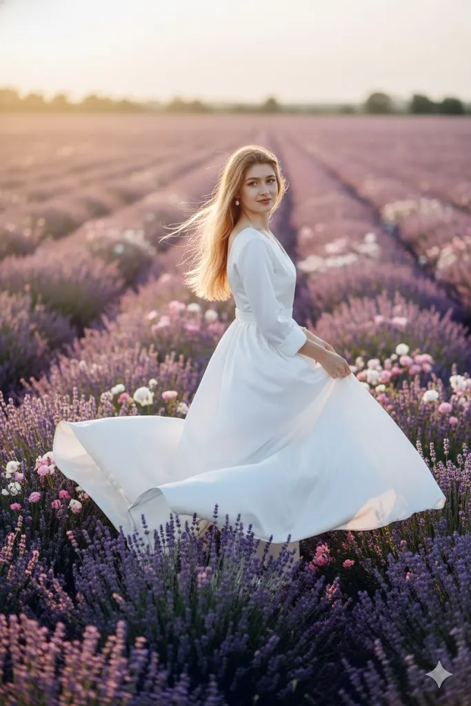 Edit the photo and place the subject in a wide field of lavender and wild roses during soft sunset. Change outfit to flowing white silk gown moving with wind. The face and identity must stay identical to original image. Background should look soft and romantic with slight haze. Use dreamy light effect but keep skin sharp and realistic with natural freckles. Add soft backlight around hair for glow effect. Image should look like luxury perfume ad.
