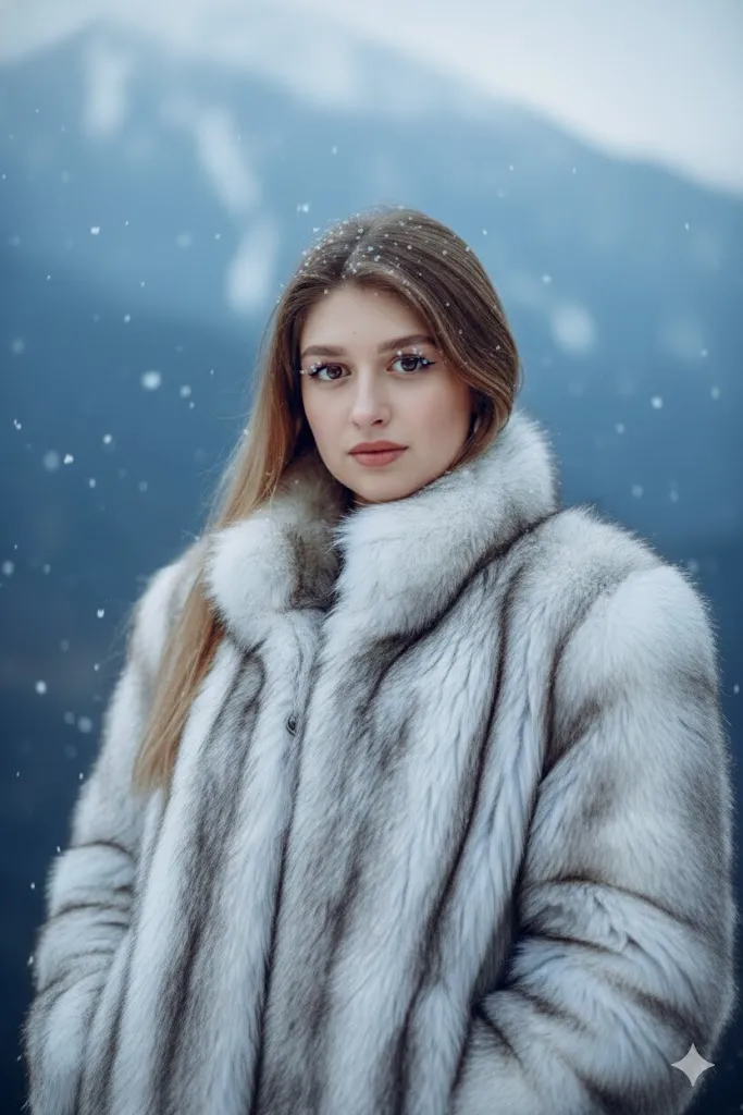 Take the person in the photo and place them in a snowy, cinematic mountain landscape. Change the clothing to a heavy, luxury faux-fur coat in white and silver tones. The background should be misty blue mountains and falling snowflakes. Keep the facial features of the original person exactly the same. The lighting should be cold and crisp, highlighting the eyes. Ensure the skin looks realistic with a slight natural flush from the cold. The image should be ultra-detailed, showing individual snowflakes on the eyelashes and the rich texture of the fur coat. 8K resolution, cinematic cold color grading.