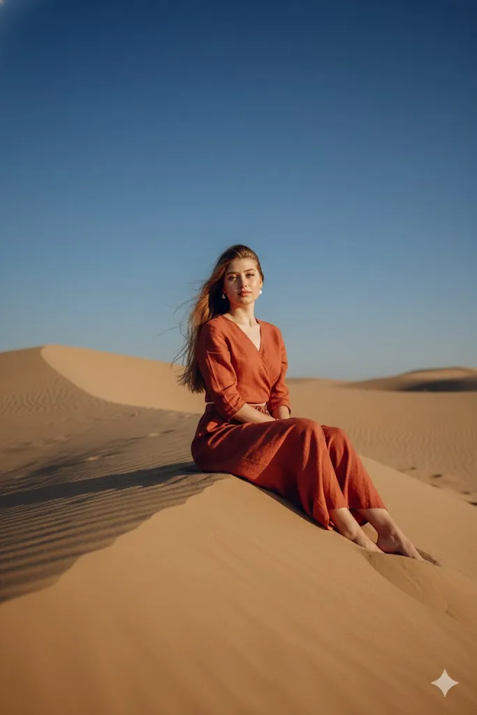 Recreate the photo in a wide golden sand desert during blue hour after sunset. Change outfit to stylish terracotta linen set. The person should pose elegantly on a sand dune. Maintain original face and expression fully same. Background should show open desert sky with few stars visible. Use cinematic light that defines jawline and body shape. Show real sand texture and natural fabric feel. Keep image pure and high quality without distortion.