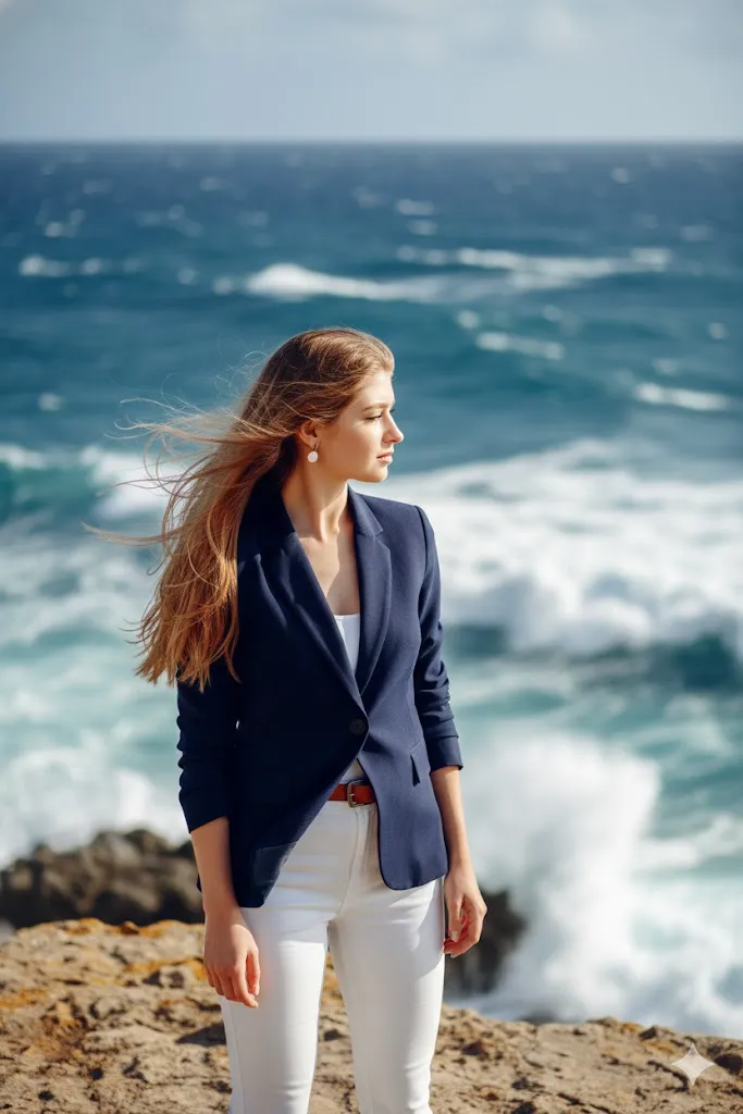 Edit the uploaded photo to place the subject on a dramatic rocky cliff overlooking a crashing blue ocean. Change the clothing to a stylish navy blue blazer and white trousers. The person should be looking out toward the sea with a wind-swept hair effect. Ensure the face remains exactly like the original photo. The lighting should be the bright, clear light of a Mediterranean afternoon. The background should show realistic white waves and deep blue water with a cinematic bokeh effect. The skin should look sun-kissed and natural, with 8K clarity and a professional travel-blog aesthetic.