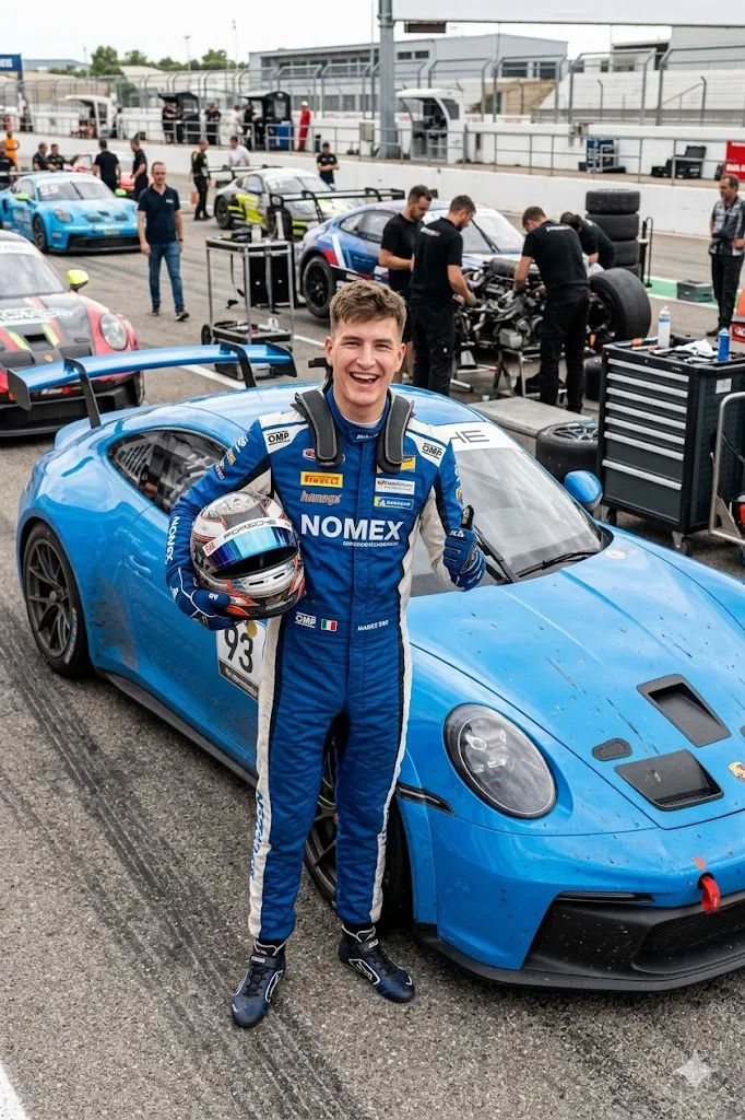 Edit my photo and place me beside a bright blue Porsche 911 GT3 at a racing track. I am wearing full racing clothes and holding a racing helmet in my left hand. I have a big happy smile like I just finished a race. The car has small dust marks and tire marks to show it was used on the track. The background shows a racing paddock area with other cars and mechanics working. The lighting is bright natural daylight and the photo shows energy and excitement of racing life.