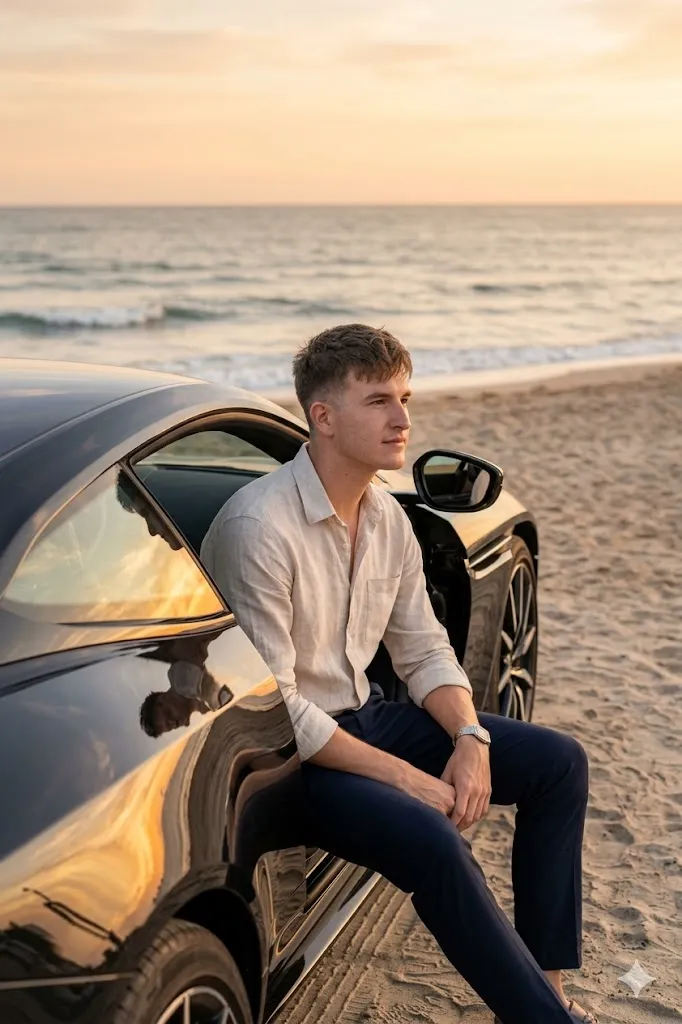 Edit my photo and place me sitting on the door frame of a black Aston Martin DB11 on a quiet beach during sunset. I am wearing a light linen shirt and dark pants. I am looking towards the ocean with a calm and confident face. The sunset light is orange and golden and it reflects on the car body and water. The scene looks peaceful and beautiful. The background ocean and sky are soft and natural while my face and the car remain sharp and clear.