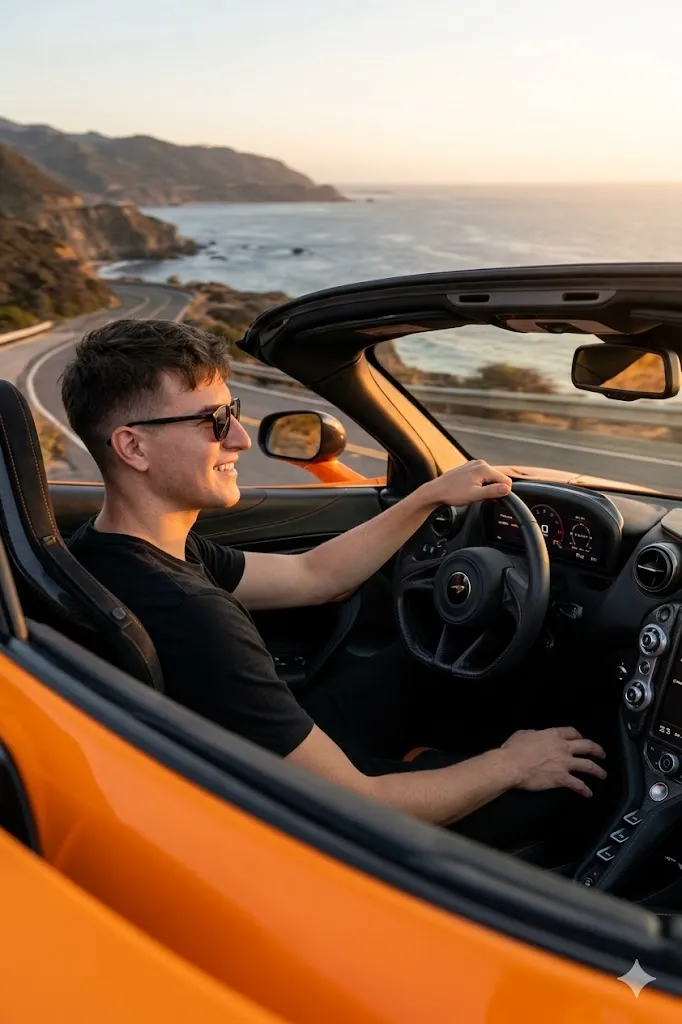 Edit my photo and place me inside a bright orange McLaren 720S driving on a scenic coastal road. I am wearing a simple black t shirt and sunglasses. I am looking ahead with a relaxed smile while the ocean view appears beside the road. The sunset light is warm and golden and it lights the landscape. The interior of the car looks modern and detailed. The photo should feel like a cinematic road trip moment.
