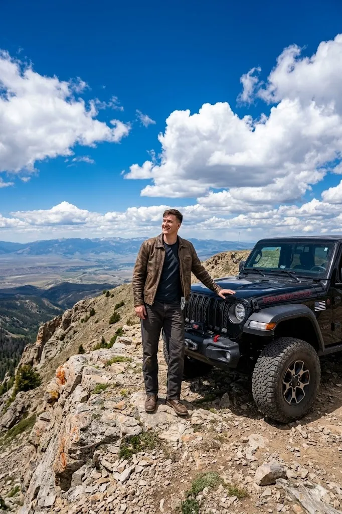 Edit my photo and place me standing on the top of a mountain beside a deep blue Lamborghini Huracan. I am wearing a strong leather jacket over a dark shirt with boots. I am standing proudly and looking over the mountain view with a confident smile. The sky is deep blue with a few clouds and the car is parked near the edge of a cliff. The scene should show the power of nature and the strong presence of the off roading car in usa.