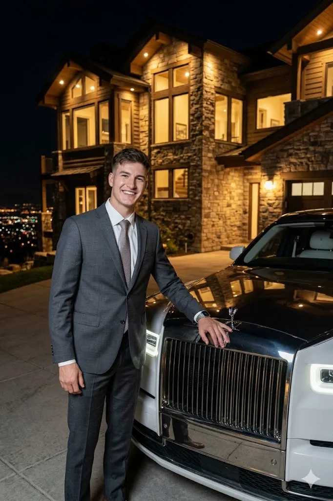 Edit my photo and place me in front of a big luxury house in usa, beside a white Rolls Royce Phantom. I am wearing a grey suit and white shirt and I look confident and powerful. The city lights are glowing below in the night creating beautiful light patterns. My hand is gently touching the front grille of the car. The reflections of city lights are visible on the car body. The image should look like a high quality night photo with luxury lifestyle vibes.
