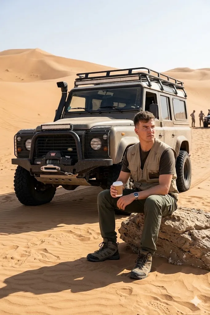 Edit my photo and place me beside a modified Land Rover Defender in a large desert area. I am wearing a utility vest over a dark shirt with cargo pants. I look determined and strong while looking across the sand dunes. The sunlight is strong and bright and creates shadows on the sand. The car shows small dust marks and strong off road design. The scene should show adventure and survival in a desert landscape.