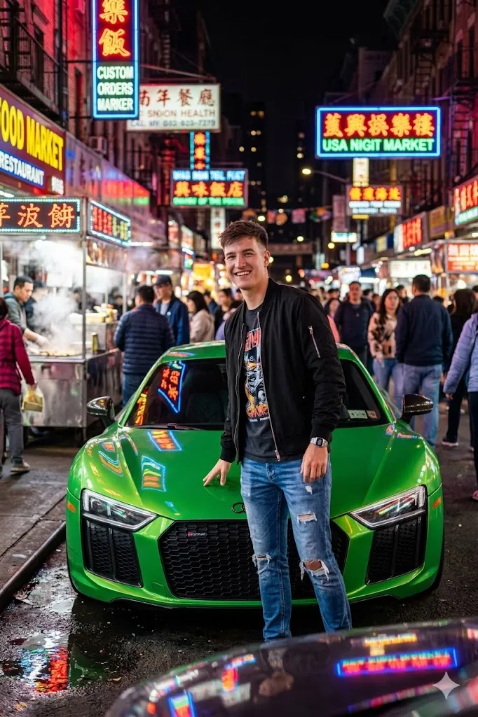 Edit my photo and place me beside a bright green Audi R8 in a busy usa night market full of neon lights. I am wearing a black bomber jacket with a graphic shirt and ripped jeans. I look curious and confident. The neon signs create colorful reflections on the car and the street. My right hand is touching the hood of the car. The photo should feel vibrant with bright colors and real night atmosphere.