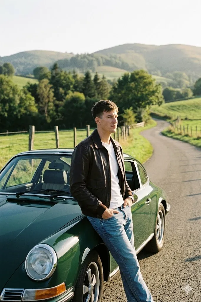 Edit my photo and place me leaning against a dark green classic Porsche 911 on a quiet country road. I am wearing a leather jacket with a white t shirt and faded jeans. I am looking far away with a thoughtful and confident face. The background shows hills and trees in soft afternoon sunlight. The car looks clean and classic showing its timeless design. The photo should feel calm and nostalgic like an old film scene.