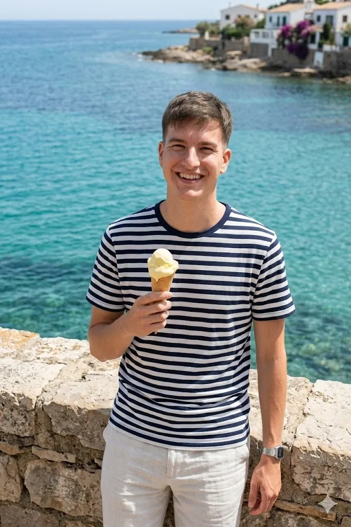Create a Mediterranean style summer photo. You are standing on a stone balcony with a view of clear turquoise sea water. You are wearing a classic striped sailor style shirt which fits the seaside theme. In your hand you are holding a lemon gelato cone. Bright sunlight creates natural shadows on your face and clothes. The AI keeps your real face identity the same so people can easily recognize you. The stone wall texture and sea water waves look very clear and realistic.