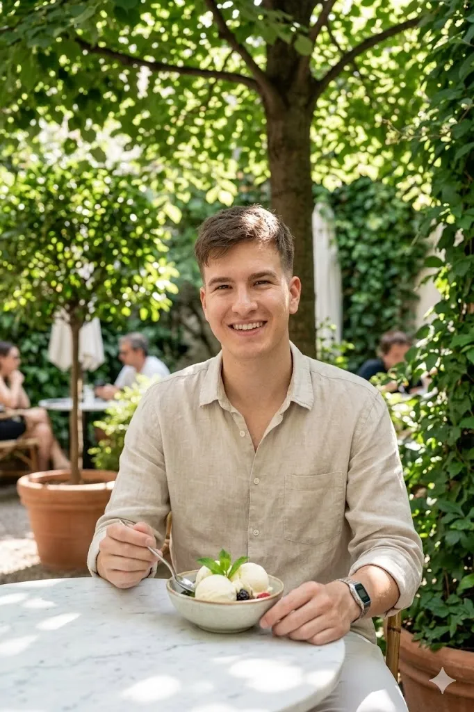 This scene creates a calm summer cafe photo. You are sitting at a marble table inside a green garden cafe full of plants and trees. Your outfit is simple and minimal with beige or cream color clothing. On the table there is a bowl of premium ice cream with fresh mint leaves. The sunlight passes through tree leaves and creates soft natural light spots on the scene. Your face appears sharp and clear while the garden background stays soft and artistic.